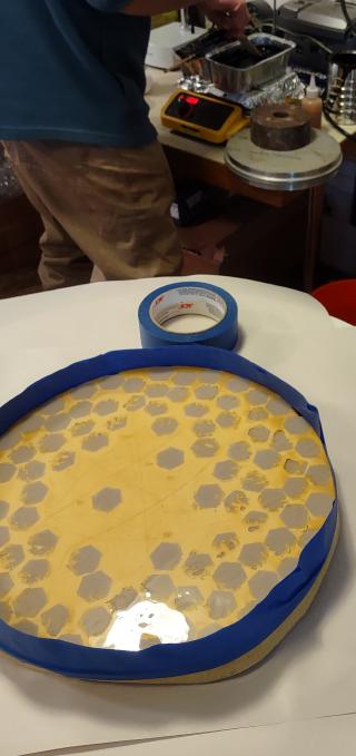 I created a pitch lap, a tool used for the last two steps of mirror making. I will use it for polishing and figuring. Pitch, also known as asphalt, is a viscous liquid like honey and will flow to match the shape of the mirror when pressed against it.